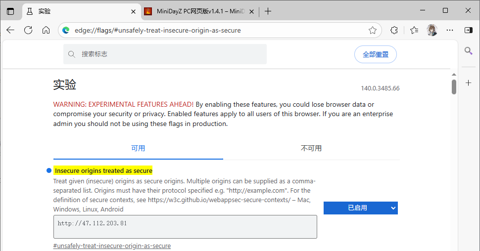 - 在地址栏输入 chrome://flags/#unsafely-treat-insecure-origin-as-secure